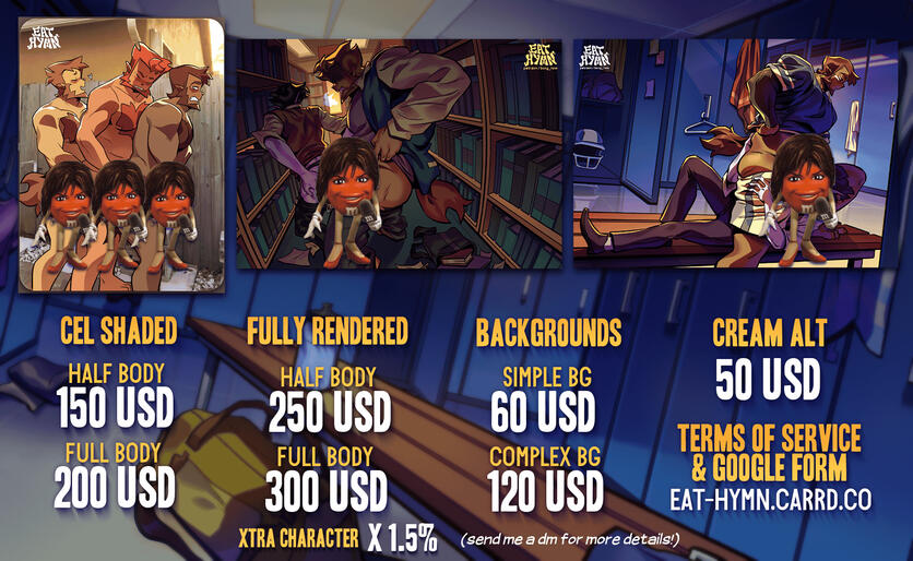 ► Personal use only. Commercial use is not allowed.► You may request that your commission not be publicly shown, but I may use the artwork in my portfolio and on my social media.► Reproducing, editing, or tracing the commissioned artwork in any form is not allowed.► You may post or promote your commissioned artwork as long as proper credit is given.► Commercial use requires an additional fee (e.g., YouTube/Twitch thumbnails, advertisements, merchandise, game assets, etc.).► NFT use is strictly prohibited. Violators will be blacklisted.► The commissioned artwork may not be used for generative AI training, datasets, or machine learning. Unauthorized use will require additional compensation and may result in blacklisting.